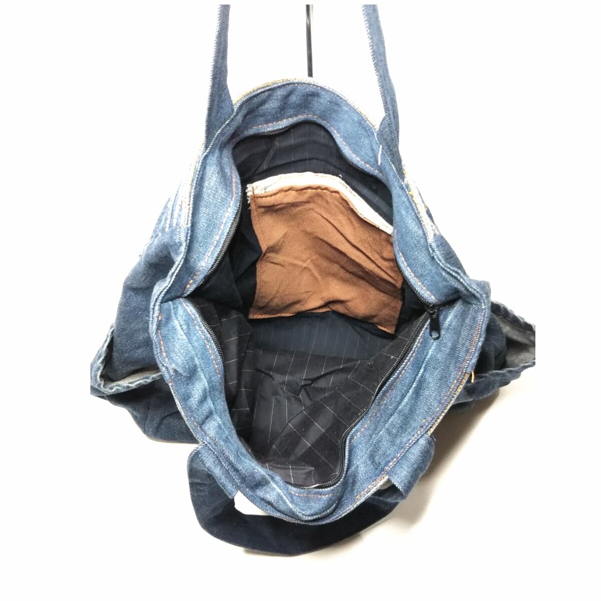 リメイクデニム素材使用で安心取引のエスニック手作業品の為 色合い風合い部品ダメージ スレ シミ ペイント 他等 裁断個体で多少細部のサイズ違いを含めて (致命的以外) 味わい有る手作り商品と基準判断しておりますおおらかに個性とご理解頂きご愛用頂ける方にお願い致します
